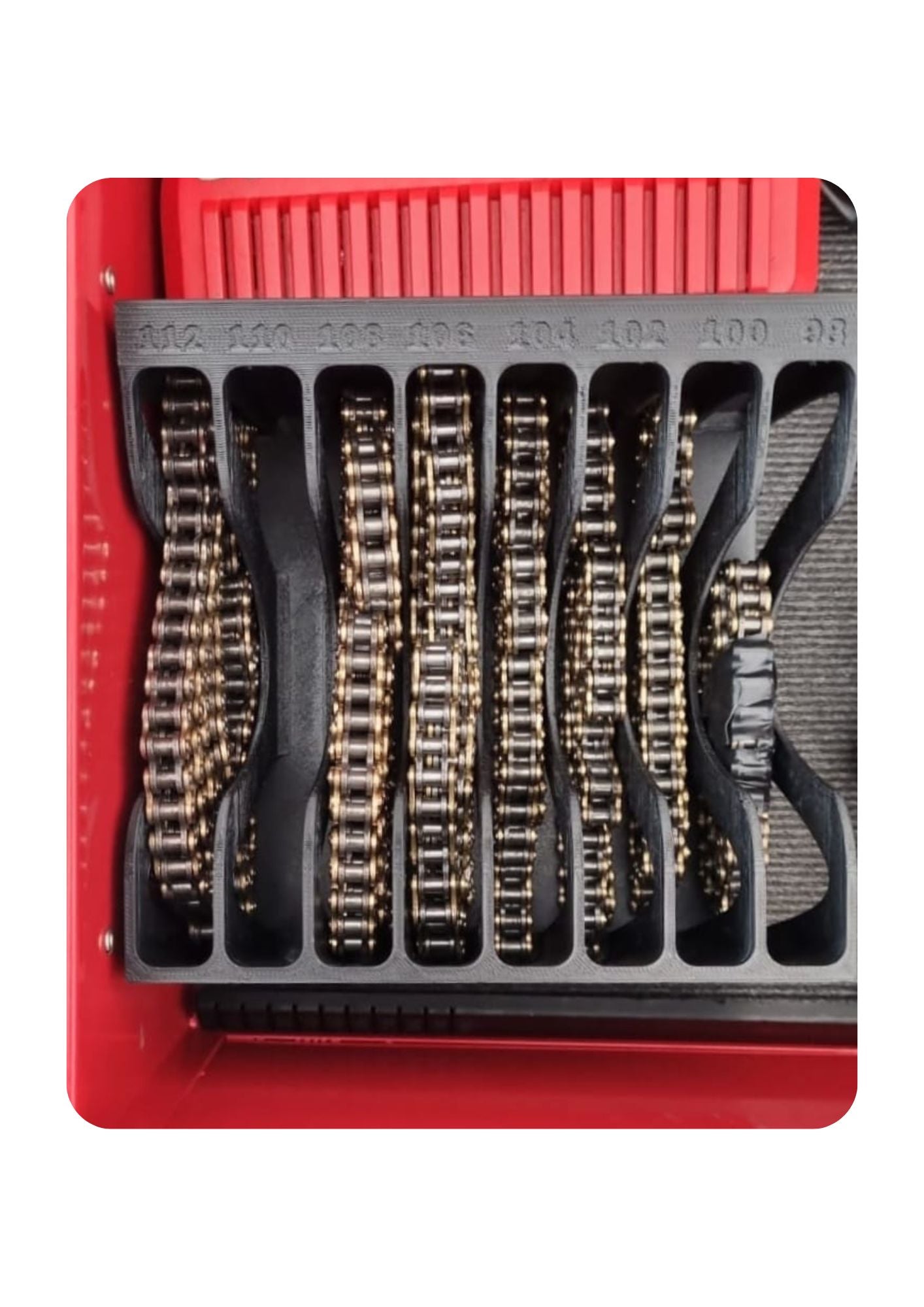Organizer porta catene da cassetto per la pista personalizzabile. Ogni organizer può portare 16 catene DID, anche con oring.