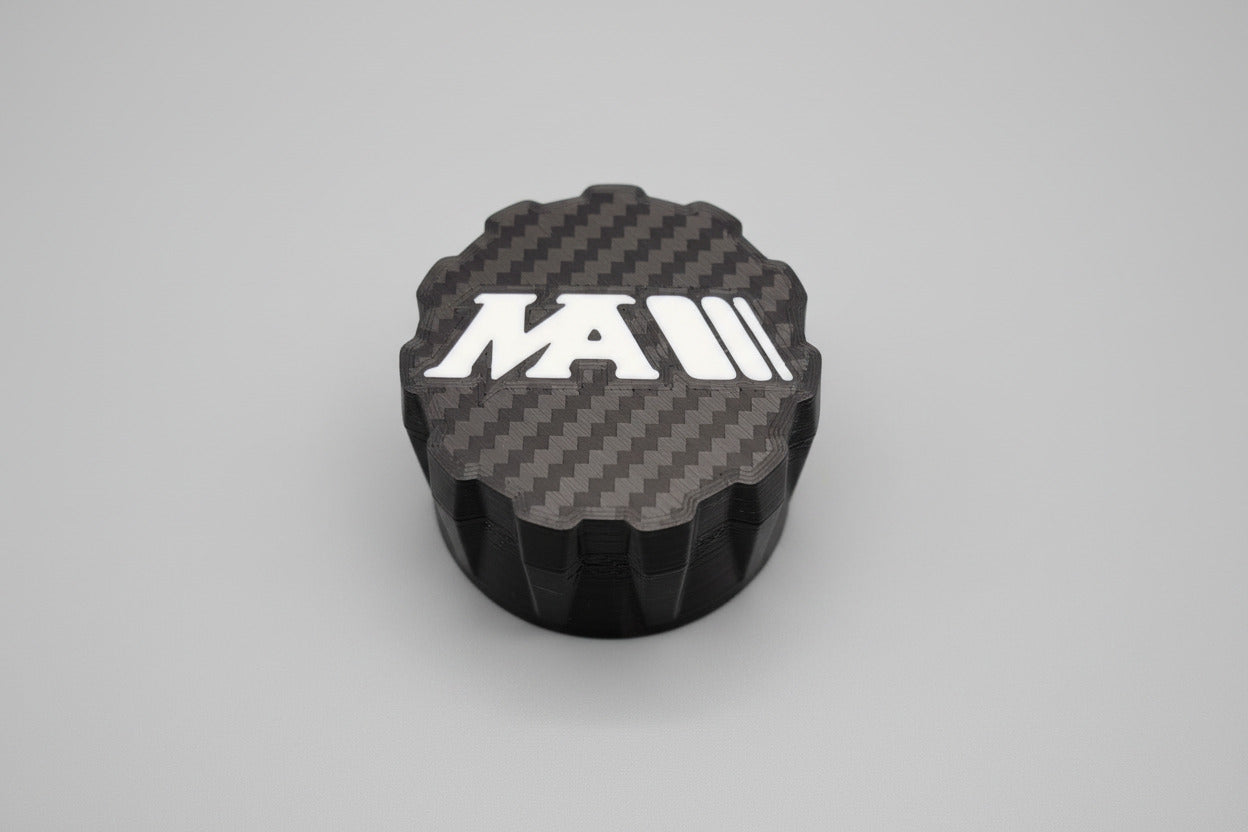 Vengono realizzati in GOMMA nera di media durezza, leggermente elastica e duratura, con effetto CARBON LOOK superficiale. I tappi sono personalizzabili con icona bianca del vostro logo.